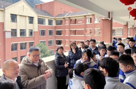 在虞文斌校長的陪同下,林建一一行實地查看了學(xué)校的教學(xué)樓、校園環(huán)境及配套設(shè)施設(shè)備等。行進途中,林建一不時駐足,與課間休息的學(xué)生們親切交談,詢問他們的學(xué)習(xí)情況,并為他們加油打氣,勉勵他們把握學(xué)校提供的良好學(xué)習(xí)條件,優(yōu)質(zhì)的教學(xué)資源與氛圍,在今后的學(xué)習(xí)中繼續(xù)刻苦努力、力爭上游,取得理想的成績。