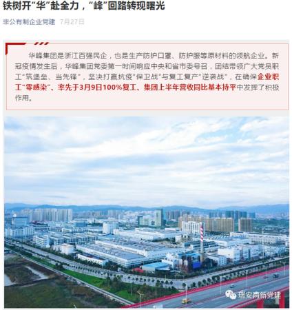 華峰集團(tuán)是浙江百強(qiáng)民企,也是生產(chǎn)防護(hù)口罩、防護(hù)服等原材料的領(lǐng)航企業(yè)。新冠疫情發(fā)生后,華峰集團(tuán)黨委第一時間響應(yīng)中央和省市委號召,團(tuán)結(jié)帶領(lǐng)廣大黨員職工“筑堡壘、當(dāng)先鋒”,堅(jiān)決打贏抗疫“保衛(wèi)戰(zhàn)”與復(fù)工復(fù)產(chǎn)“逆襲戰(zhàn)”,在確保企業(yè)職工“零感染”、率先于3月9日100%復(fù)工、集團(tuán)上半年?duì)I收同比基本持平中發(fā)揮了積極作用。