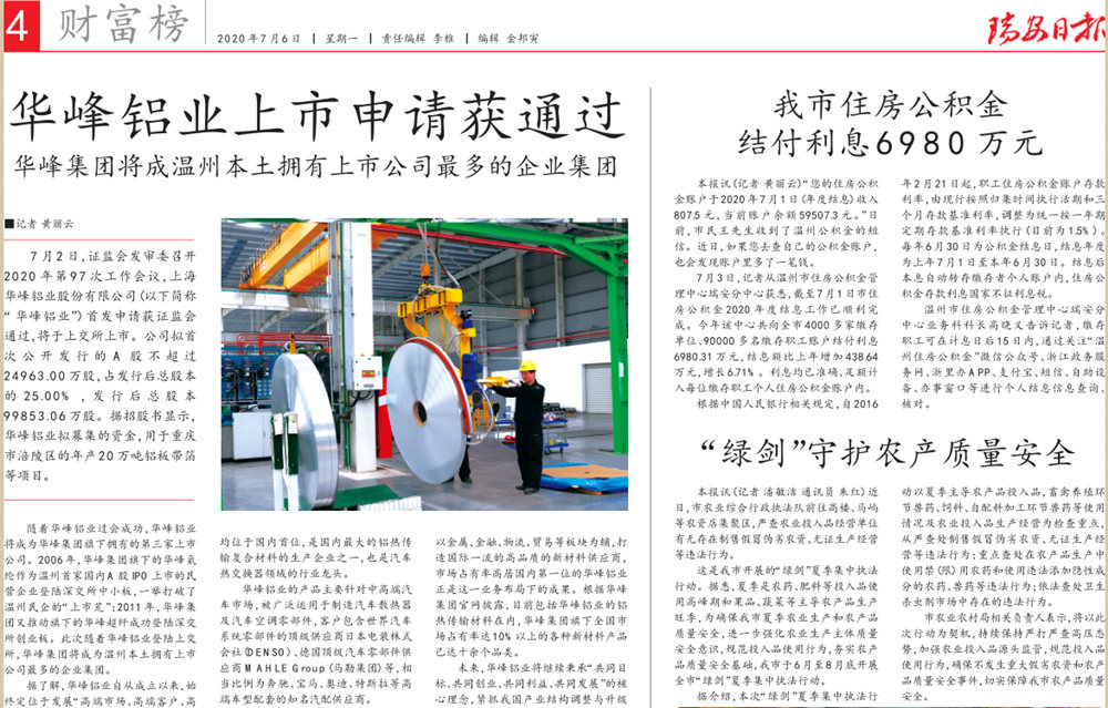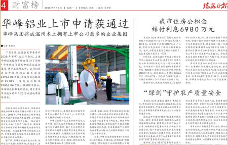 隨著華峰鋁業(yè)過會成功,華峰鋁業(yè)將成為華峰集團(tuán)旗下?lián)碛械牡谌疑鲜泄尽?/span>2006年,華峰集團(tuán)旗下的華峰氨綸作為溫州首家國內(nèi)A股IPO上市的民營企業(yè)登陸深交所中小板,一舉打破了溫州民企的“上市荒”;2011年,華峰集團(tuán)又推動(dòng)旗下的華峰超纖成功登陸深交所創(chuàng)業(yè)板。此次隨著華峰鋁業(yè)登陸上交所,華峰集團(tuán)將成為溫州本土擁有上市公司最多的企業(yè)集團(tuán)。